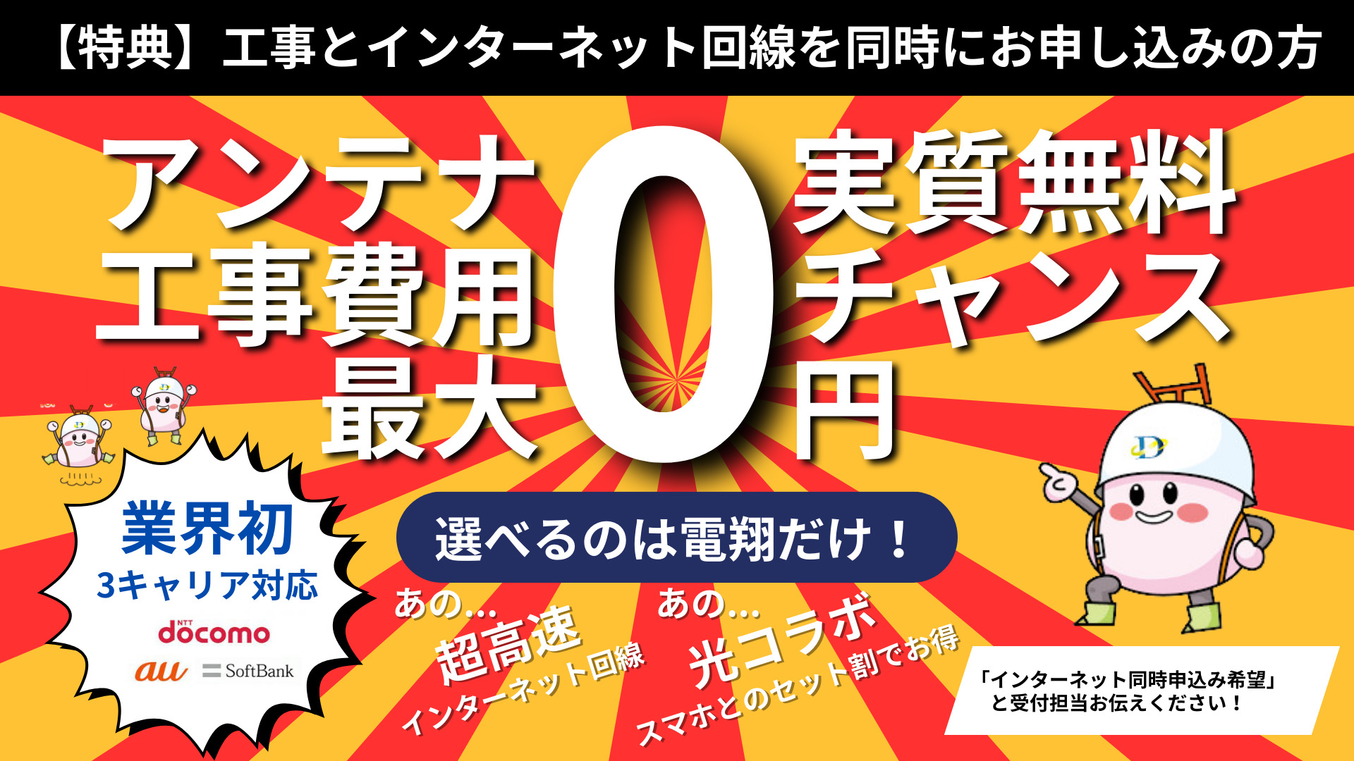 電翔では、【業界初】の選べる高速インターネット回線お申込みでテレビアンテナ工事費が最大0円で設置可能。テレビアンテナ設置で視聴環境を整備するとともに、高速回線契約で動画もゲームもストレスフリーの快適なネット環境が実現します。