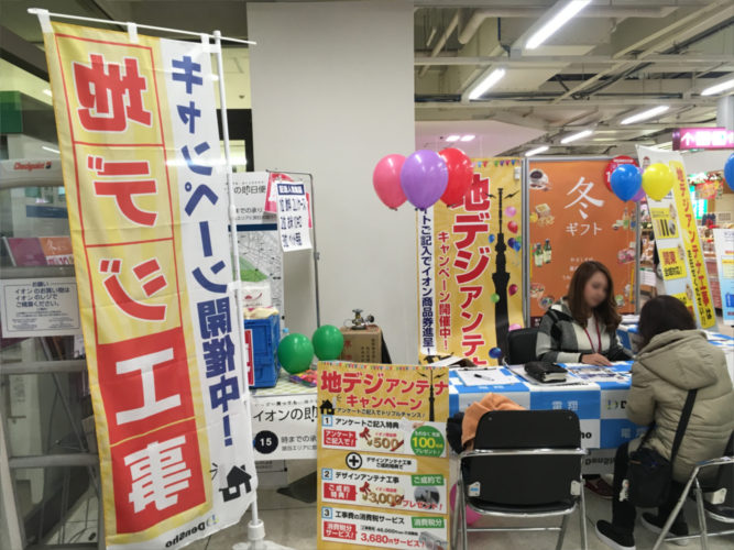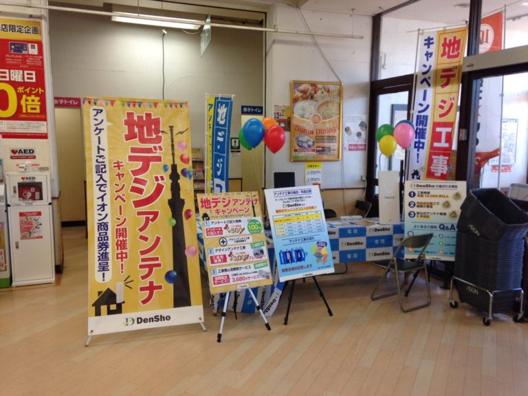 大型のスーパーの催事ブースに出展し、アンテナ工事のスペシャリスト・電翔ならではのアンテナ工事のPRを行っています。
