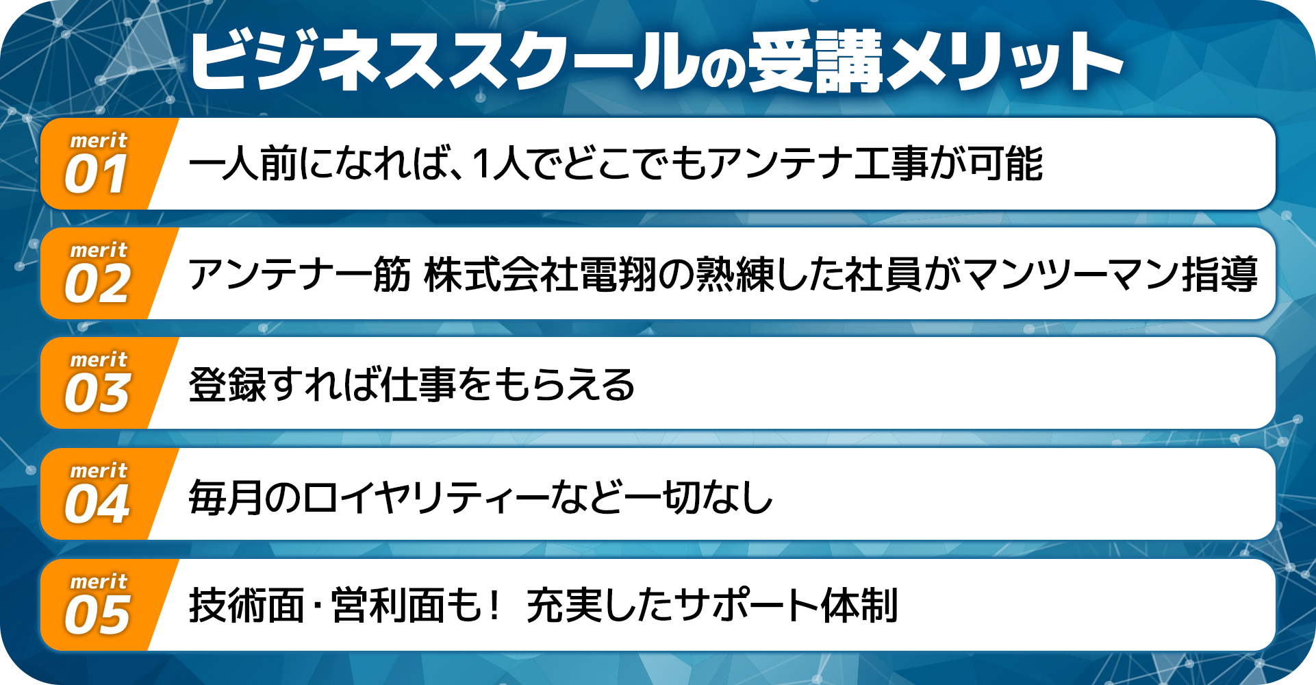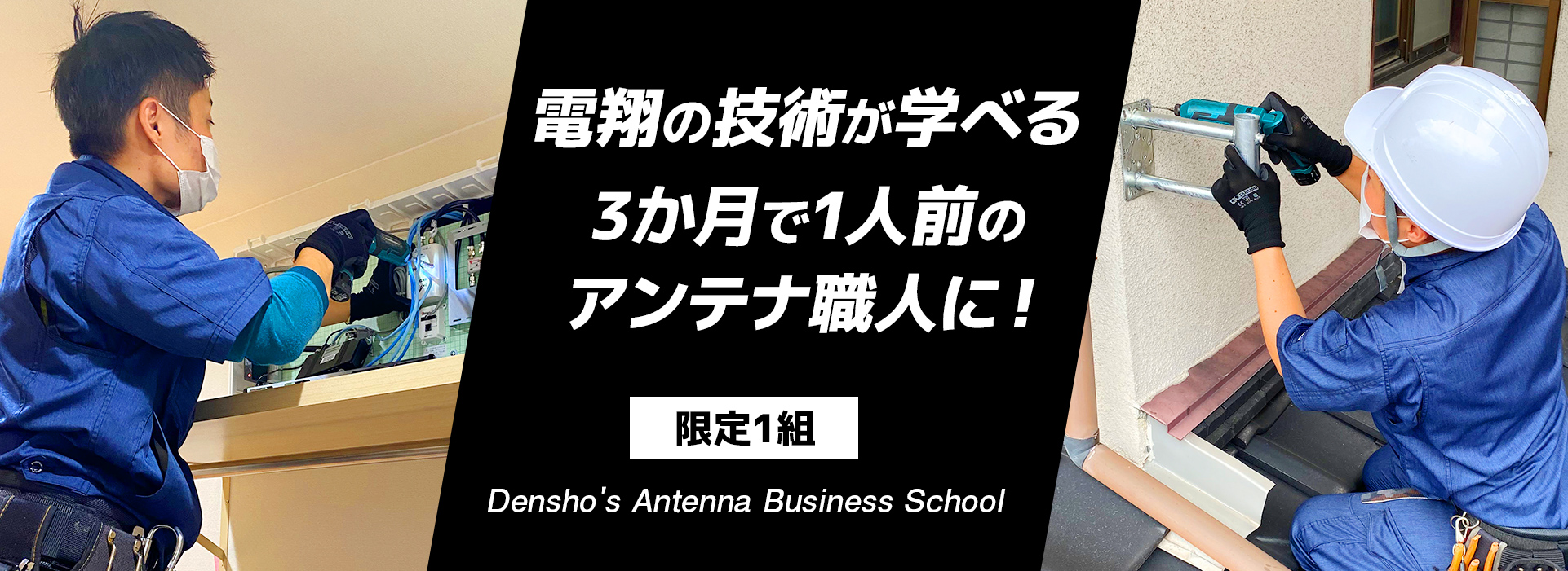 株式会社電翔のテレビアンテナ工事のノウハウを学んで、あなたも独立してみませんか?電翔が主催するアンテナビジネススクールは、アンテナ工事事業に必要な知識・技能を身につけることができます。我々は、未経験からでも一人前に育て上げられる自信・技術がありますので、熱い情熱・やる気があれば、どなたでも大歓迎です。テレビアンテナ工事を通じてお客様に喜びを感じてもらいたい気持ちをお持ちであれば、あなたはテレビアンテナ工事従事者の素質があります。ぜひ、ご入校いただき、優秀なテレビアンテナ工事事業者としての一歩を踏み出してください。