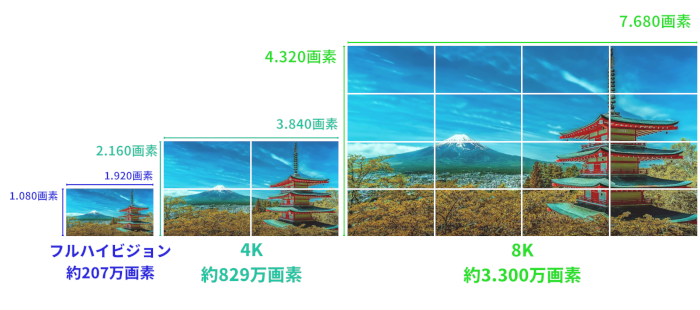 きめ細かく臨場感あふれる映像が楽しめる秘密は、画素数の違いにあります。従来のフルハイビジョンは207万画素でしたが、4K放送では829万画素と約4倍、8K放送では約3300万画素で16倍もの画素数を誇ります。大型テレビでも一つ一つの画素が、細やかに映像を再現してくれるので、これまでにない臨場感を体験できるようになりました。