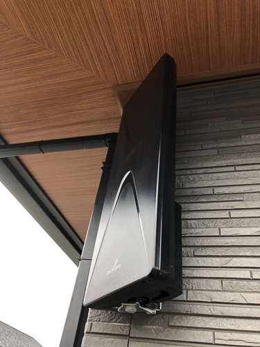 ブラックが基調の、落ち着いた雰囲気のご新築でした。軒が深く重厚感のある外観へ、黒のデザインアンテナを取り付け。壁と同系色のアンテナは、調和がとれた印象になるのでおすすめです。
