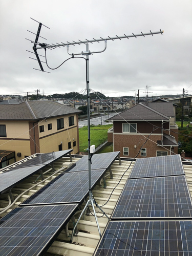 台風で、既存のアンテナが倒れてしまった案件です。もとのアンテナは傷み老朽化が見られたので撤去処分しました。屋根にはソーラーパネルがありましたが、パネルの間に屋根馬を置けばアンテナ設置も大丈夫です。