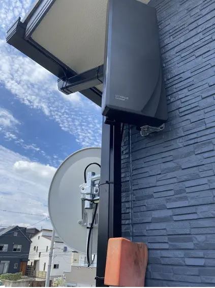 和泉市の新築住宅で地デジと衛星放送を視聴するためにデザインアンテナとBS/CSアンテナを設置しました。ダークカラーのクールな外壁にマッチするように施工。住宅の見た目を損ねず取り付けられました。