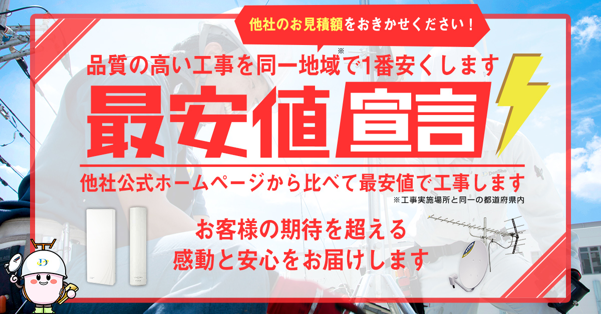 アンテナ工事業界には、お客様が納得してなくても無理に工事を進めようとする悪徳まがいの業者が残念ながら存在します。しかし、電翔は押し売りせず、見積金額と工事内容に納得していただい場合のみ工事を進めさせていただきますのでご安心ください。キャンセルも遠慮なく申し出ていただいて構いません。また、工事を結構した場合、見積から金額を上乗せして請求することも一切ございませんのでご安心ください。