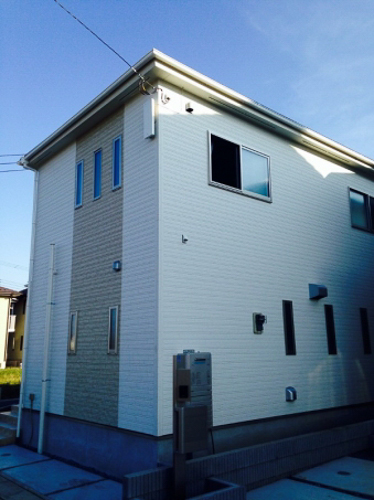 姫宮落川が流れる道佛エリア。清潔感ある外観を意識し、外壁カラーに合ったホワイト色の地デジ用デザインアンテナを選びました。電線を引き込んでいる直ぐ下に映っていますが、外観によく馴染んでいます。一見、テレビアンテナとは分からないようなフォルムも人気の秘密です。