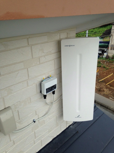 市野川が流れる羽尾エリア。明く優しい雰囲気のホワイトのレンガ調壁面に、地デジ用デザインアンテナを取り付けました。箱型の部材が並んでいますが、大きい方がアンテナ本体、小さい方が電波を強くするためのブースターです。共に軒下に隠れたたため、雨風を直接受け難くなりました。