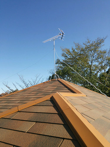 特徴的な形状の屋根上にUHFアンテナを設置しました。屋根の形状は様々ですが、アンテナの土台となる4本脚の屋根馬の配置が可能であれば、屋根上設置が実現します。設置困難な場合は、破風板への立ち上げスタイル、ベランダなどへの取り付けができる場合があります。