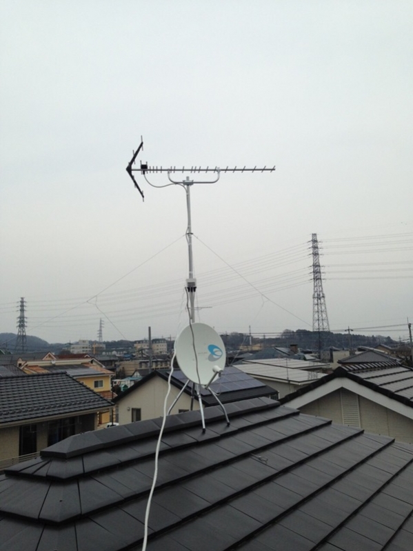 オーソドックスなスタイルのアンテナ工事例です。屋根上に地デジ用八木式アンテナと衛星放送用BS/CSアンテナを設置。高所で周りの電波遮蔽物の影響を最小限に抑えて受信できました。