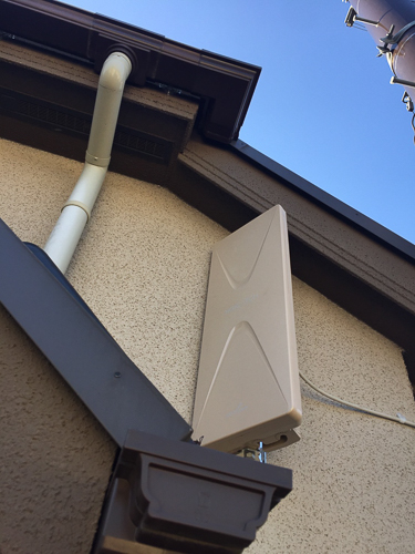 地デジ用デザインアンテナの壁面設置例です。やや下からアンテナを撮影しており、本体下部に金具が取り付けられている様子が写っています。見た目シンプルで大人気のアンテナです。