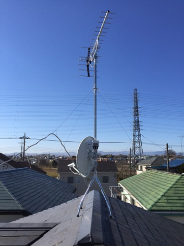 地デジと衛星放送を楽しみたい方におすすめの設置例です。高所の屋根上に八木式アンテナとBS/CSアンテナを設置して感度の強い電波受信でテレビ視聴環境を整えました。