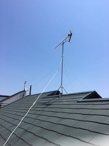 青空が眩しい屋根上に八木式アンテナを設置しました。建物が密集している立地では、この施工例のように建物の高所へ設置することで、高感度の電波受信が期待できます。