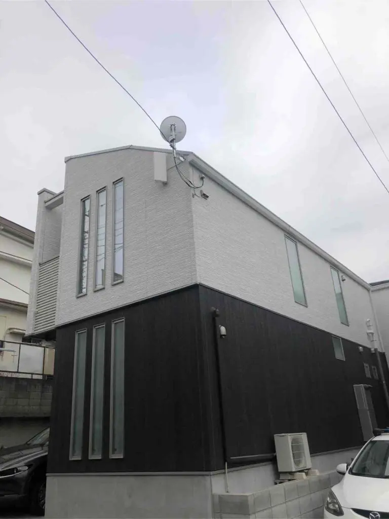1,2階のツートンカラーがオシャレな佇まいにデザインアンテナとBS/CSアンテナを使用しました。地デジと衛星放送の視聴環境が整い幅広いジャンルのテレビ番組をお楽しみいただけます。