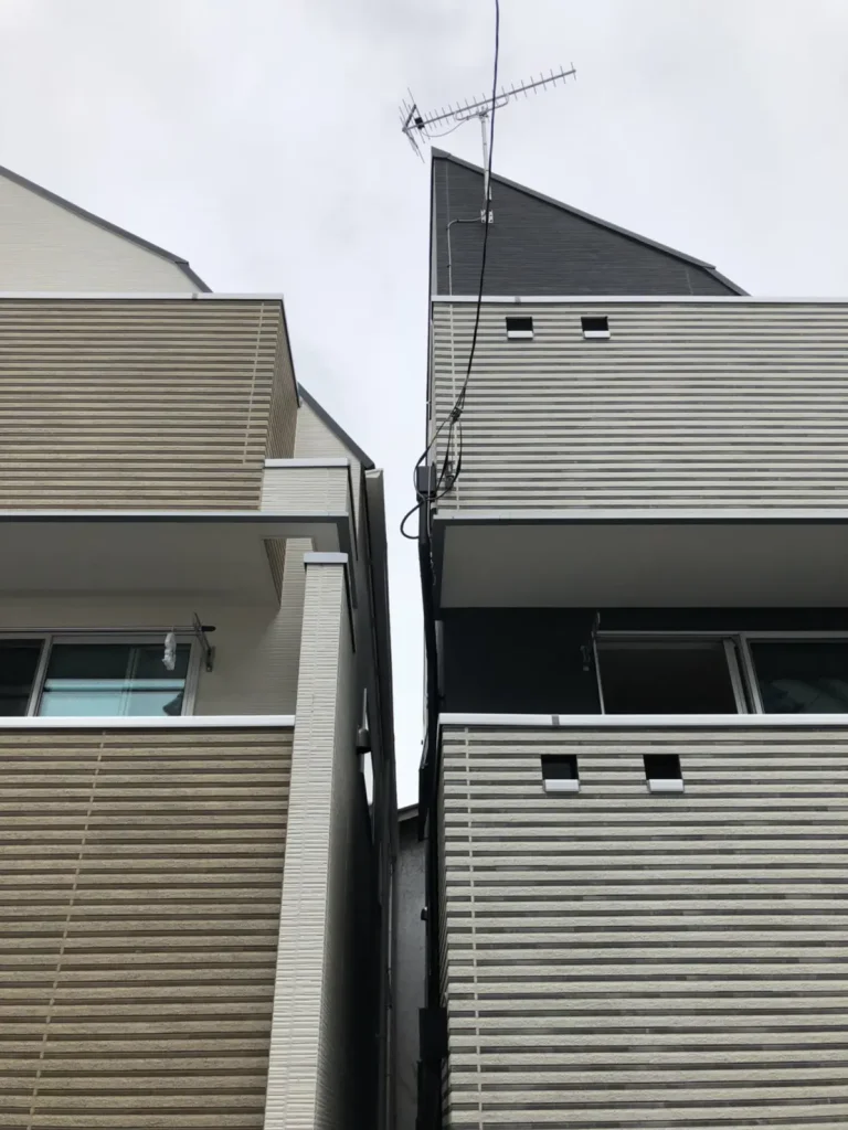 仲六郷の3階建て住宅のテレビアンテナ工事です。地デジ用八木式アンテナを最上部の外壁へ設置。お隣の住宅と間隔が小さいため、アンテナが越境しないよう工夫して工事を行いました。