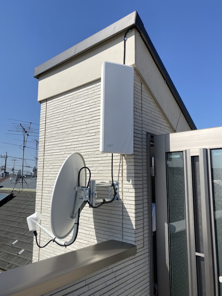 屋上テラスの外壁にデザインアンテナとBS/CSアンテナを設置した施工例です。杉並区では建物が密集している住宅街でも高所にアンテナを設置することで感度の強い電波受信がが期待できます。