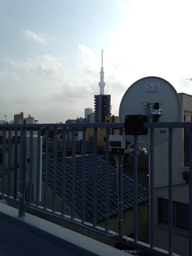 屋上の手すりに地デジ用デザインアンテナと衛星放送用BS/CSアンテナを取り付けました。手すりを支柱として使用。スカイツリーが見えるロケーションで、感度の強い電波受信を実現しました。