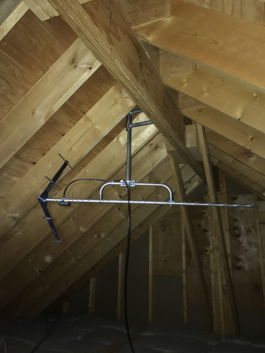 八木式アンテナの屋根裏設置例です。アンテナを外観から完全に隠す方法として注目されています。屋内設置は、建物内まで地デジ電波が十分届いていれば、実現の可能性大です。