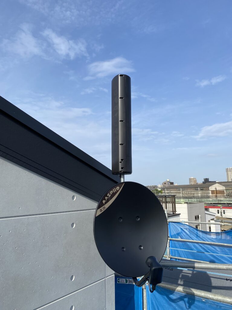 ブラックのユニコーンアンテナとBS/CSアンテナを設置。今やアンテナも色などファッション性で選べる時代です。電翔は最新アンテナの導入も早いので、選択肢の幅が広い施工をご提供できます。