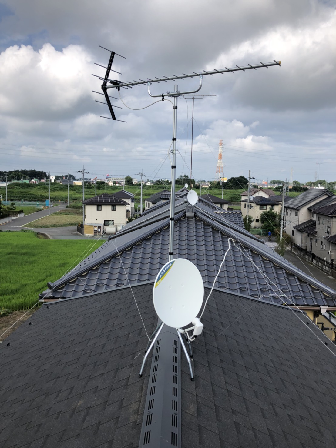 お隣のお家よりもアンテナマストの長さが短く済み、風に煽られにくい安定した取り付けとなりました🍉