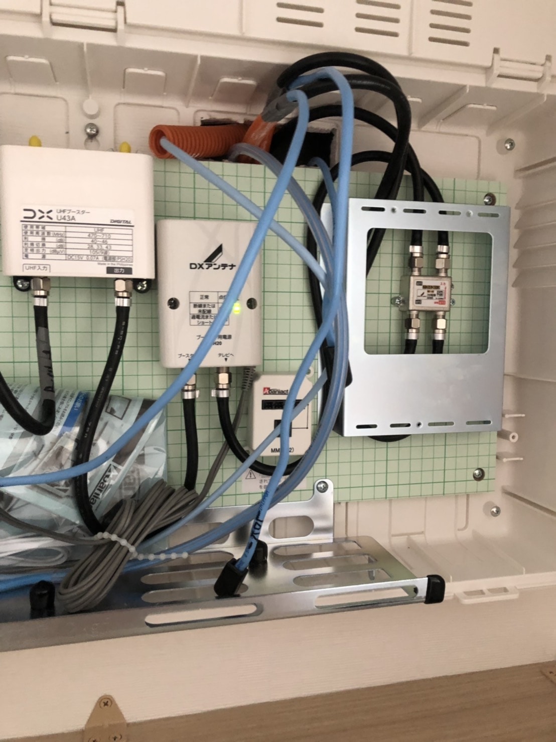 その中から、アンテナ工事で必要な配線を見つけ、ブースター電源部・ブースター本体・分配器へ繋げ、各お部屋のテレビ端子へ電波が届いているか専用の機械で確認し工事完了です😉✨