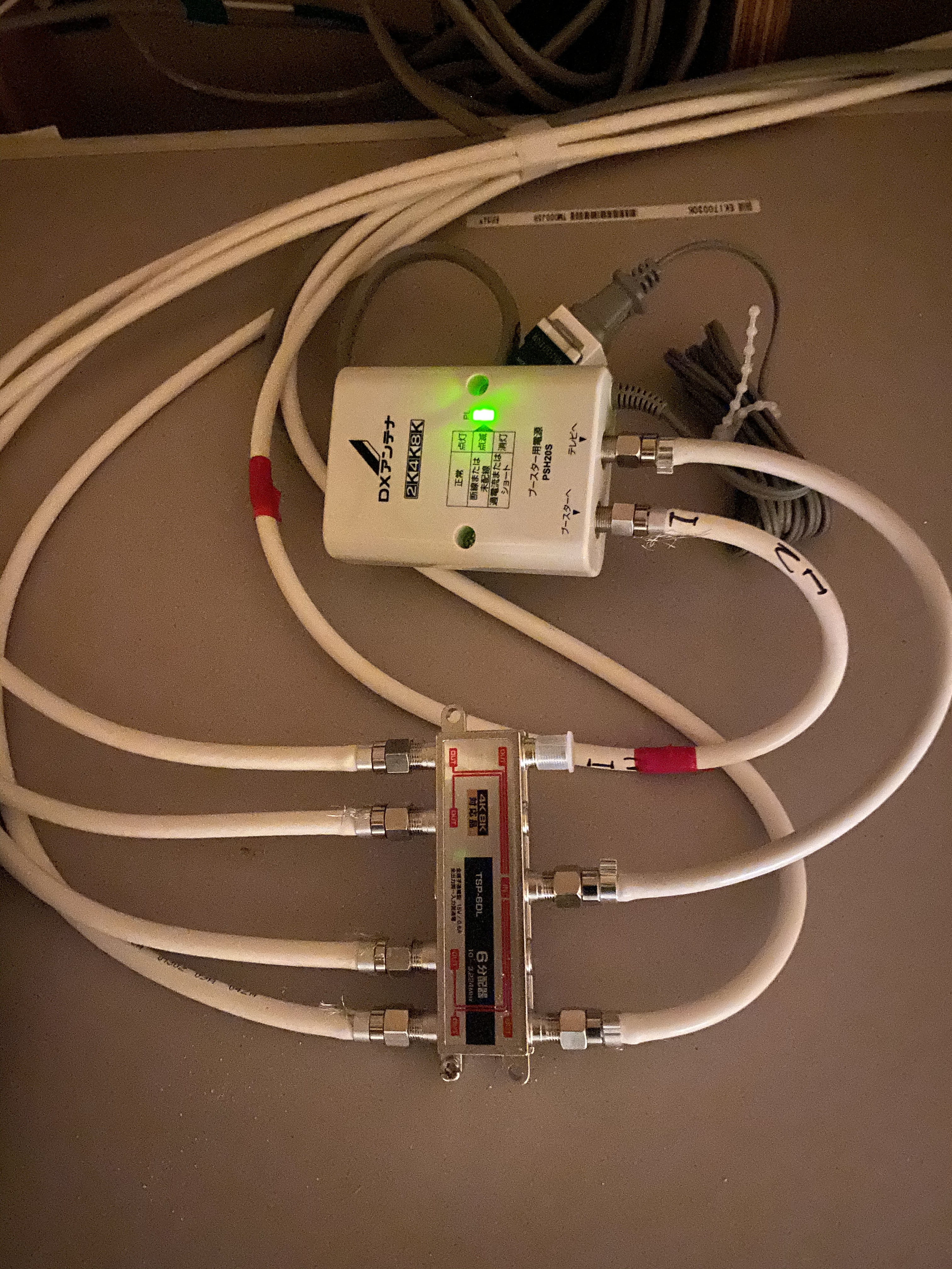 ブースターの電源部の下にある、枝分かれしているのは、分配器という機械で、アンテナ>ブースター>と伝わってきた電波を、各お部屋に分配する役目をしています🔧
