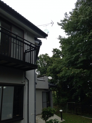 壁面取り付けしたデザインアンテナ破風板のユニコーンアンテナ屋根馬設置の八木式アンテナ