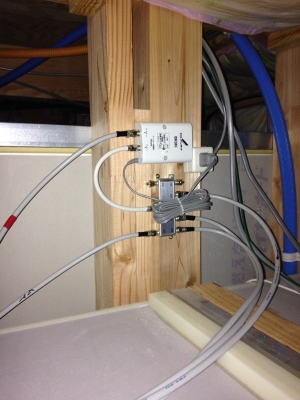 引き込み線を取った電波は、右のお写真のような配線を通って各お部屋のテレビの端子へと流れていきます。