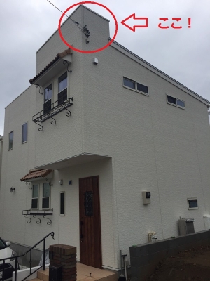 正面から見える屋根の飛び出た部分に、隠れるように取り付けてあります。