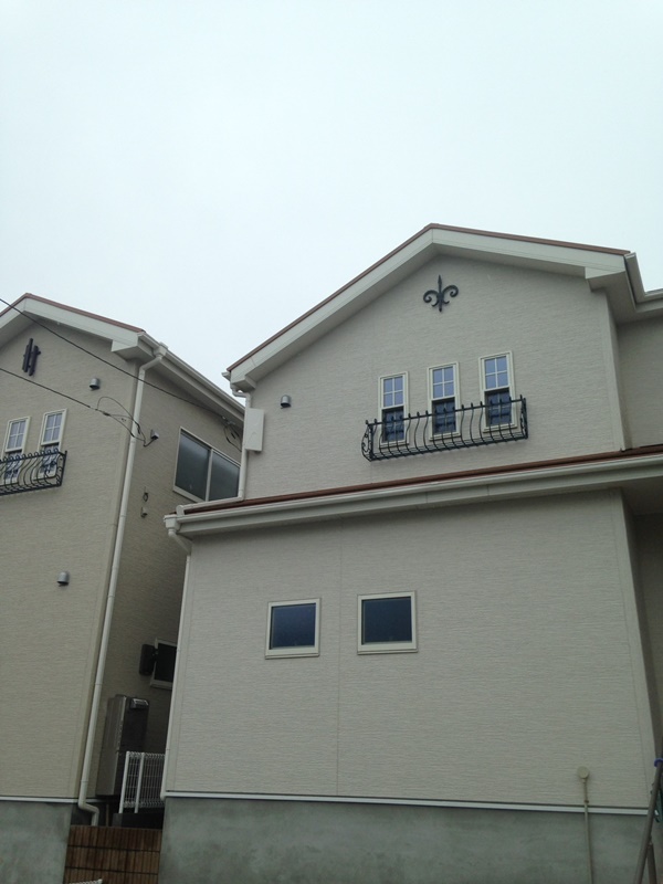 壁はベージュ系ですが、屋根の破風や窓枠、雨どいが白なので、