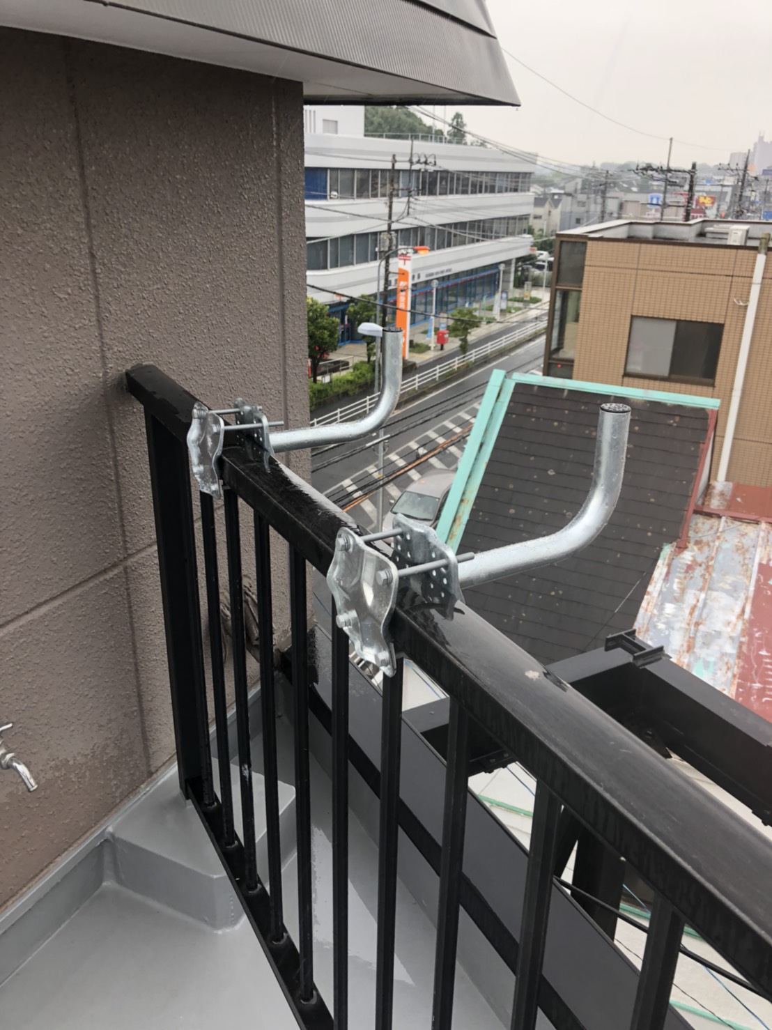手すりに象鼻金具を取り付け。テレビアンテナを設置する前
