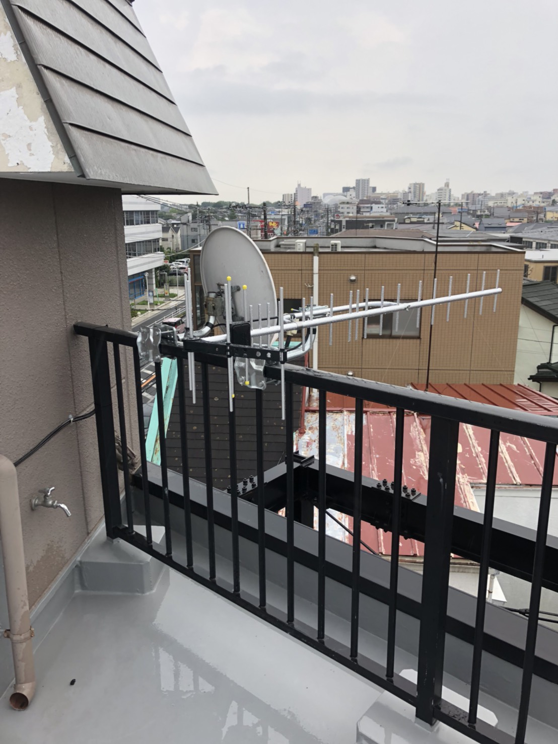 屋上の柵へ、八木式アンテナ・BS/CSアンテナともに新設させていただきました😉🔧