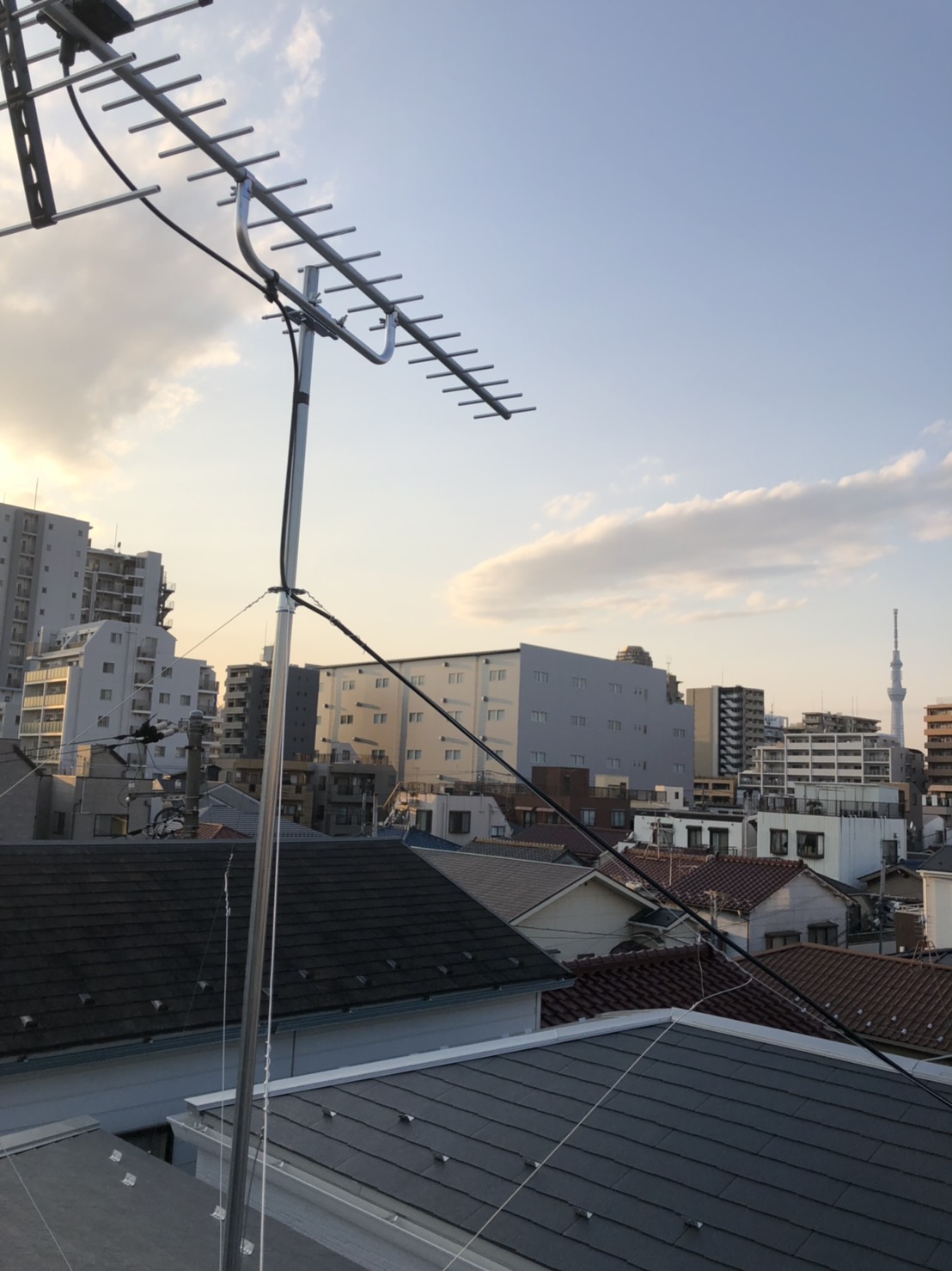 3階建て戸建物件、アンテナ工事前の写真です。遠くには、電波塔・東京スカイツリーも見えます。