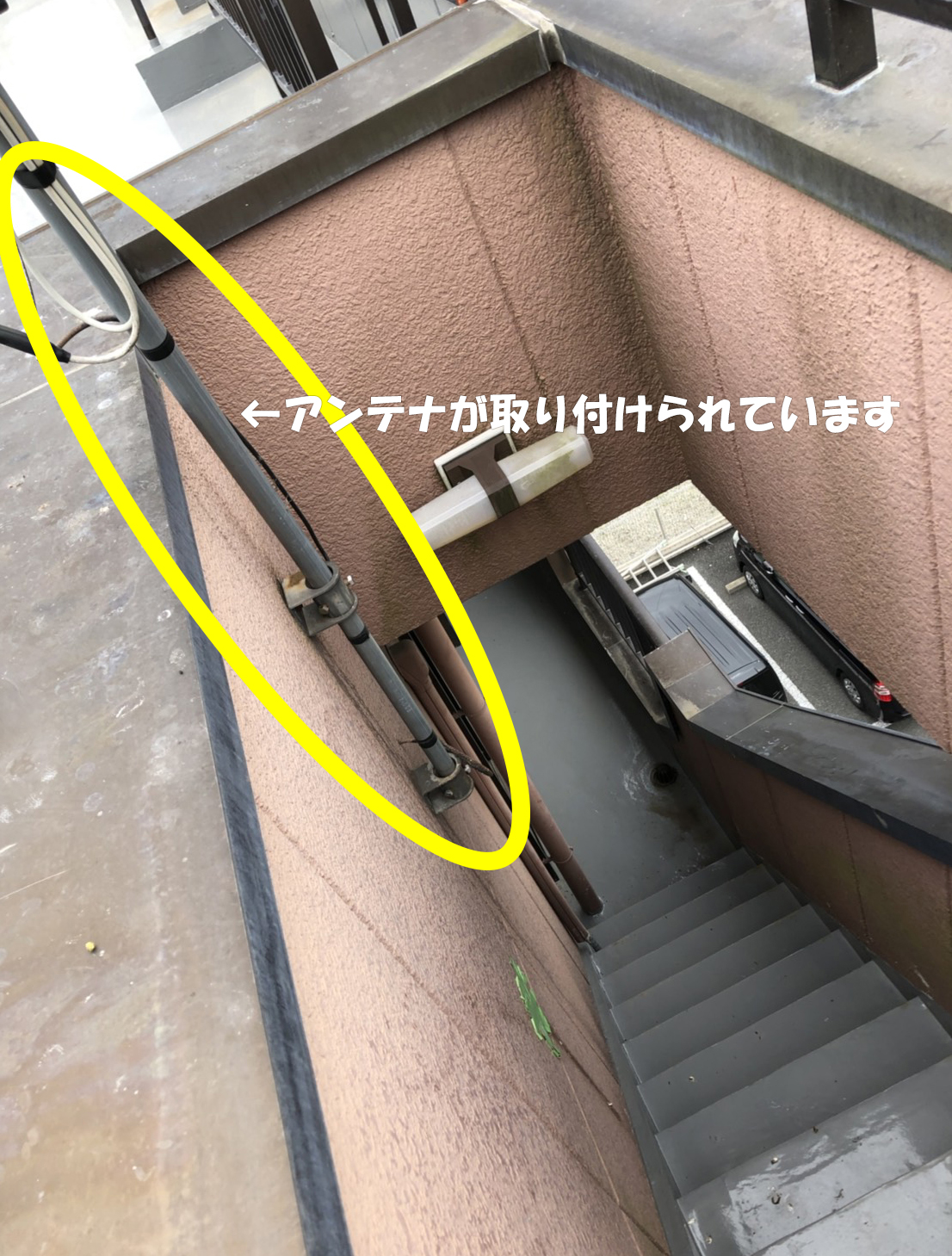まずは屋上にアンテナの状態を確認しに行くと、屋上へ繋がる階段の壁面へアンテナが取り付けられており、(右のお写真をご参照ください)さらに上を見上げると・・・お話しに伺っていた通り、アンテナが倒れてしまっていました😣💦