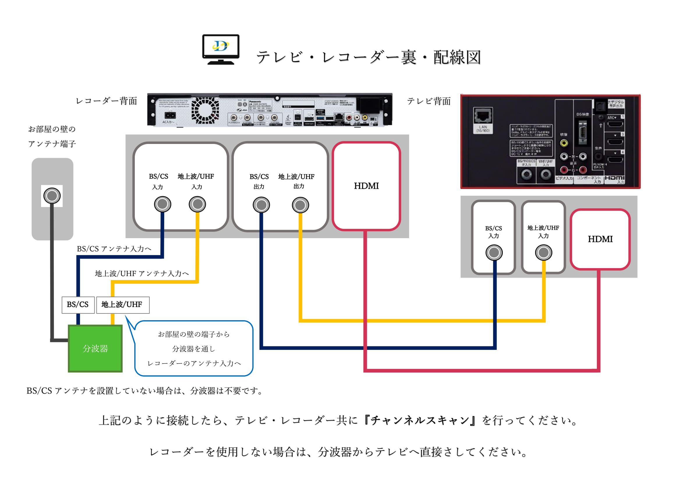 👆配線図通りに、配線を繋いで、テレビの設定画面でチャンネル設定(チャンネルスキャン)をすれば、テレビを視聴することができます❗