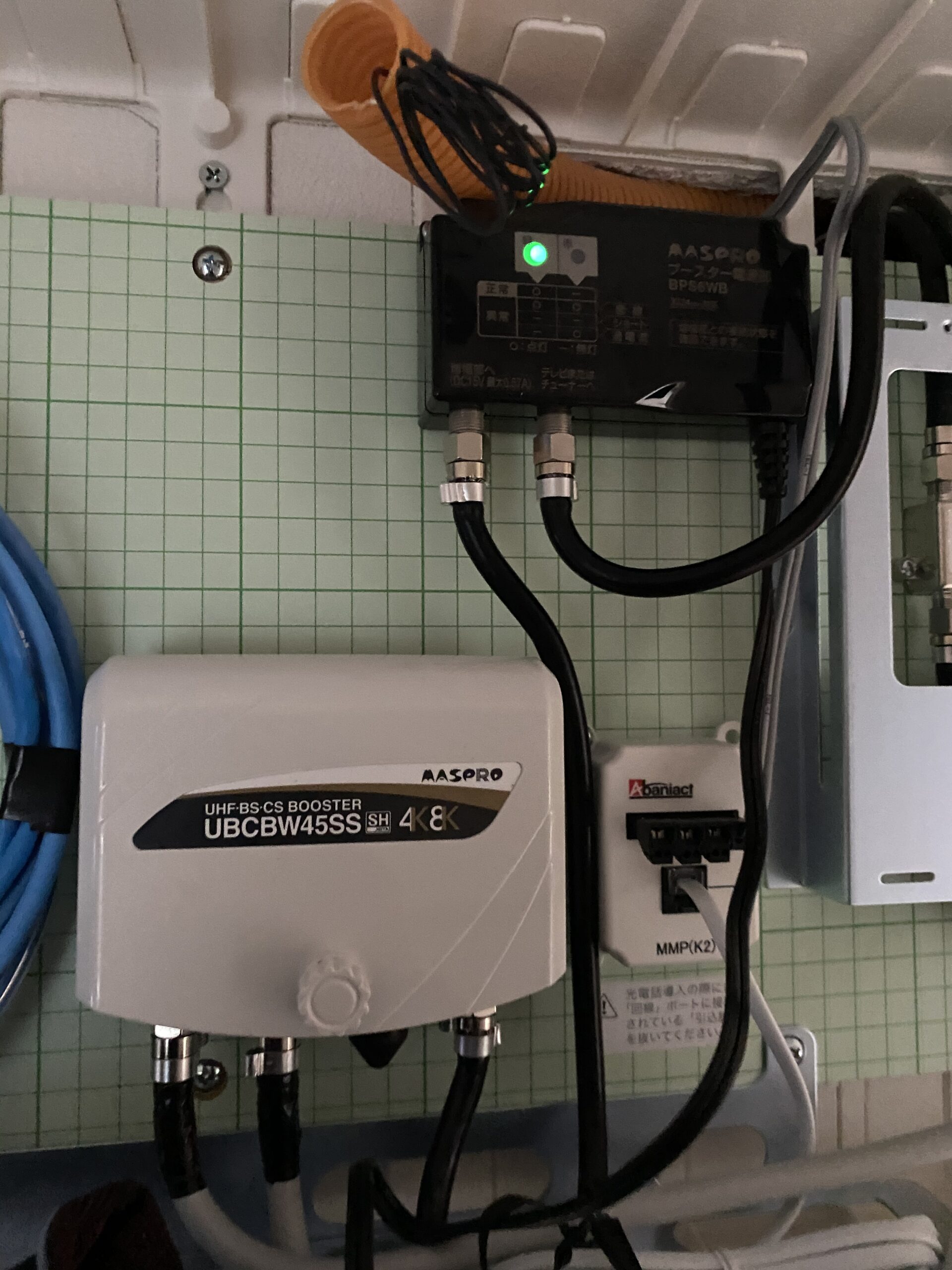 こちらは、室内に設置したブースターと呼ばれる機器のお写真📸緑に光っている黒い機器はブースターの電源部で、その下に写っている4K8Kと記載されているのが本体です⚙️