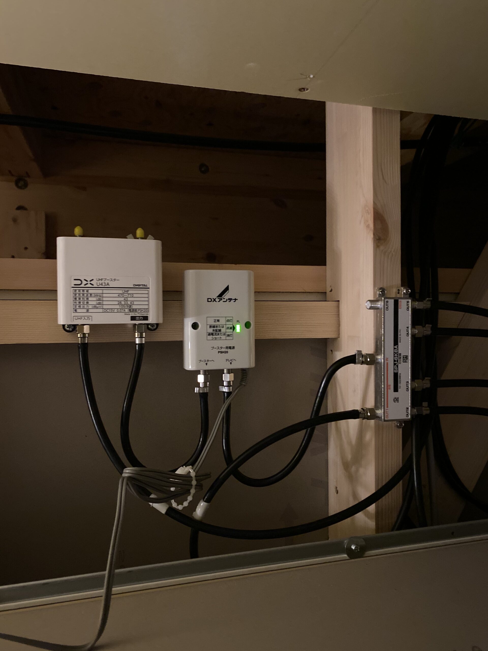 お写真の中央に設置してある緑に光っているのは、ブースターと呼ばれる機器の電源部、その左に設置してあるのは、ブースターの本体です。ブースターは主に受信した電波を最適な電波量まで増幅させる役割を担っています🔋