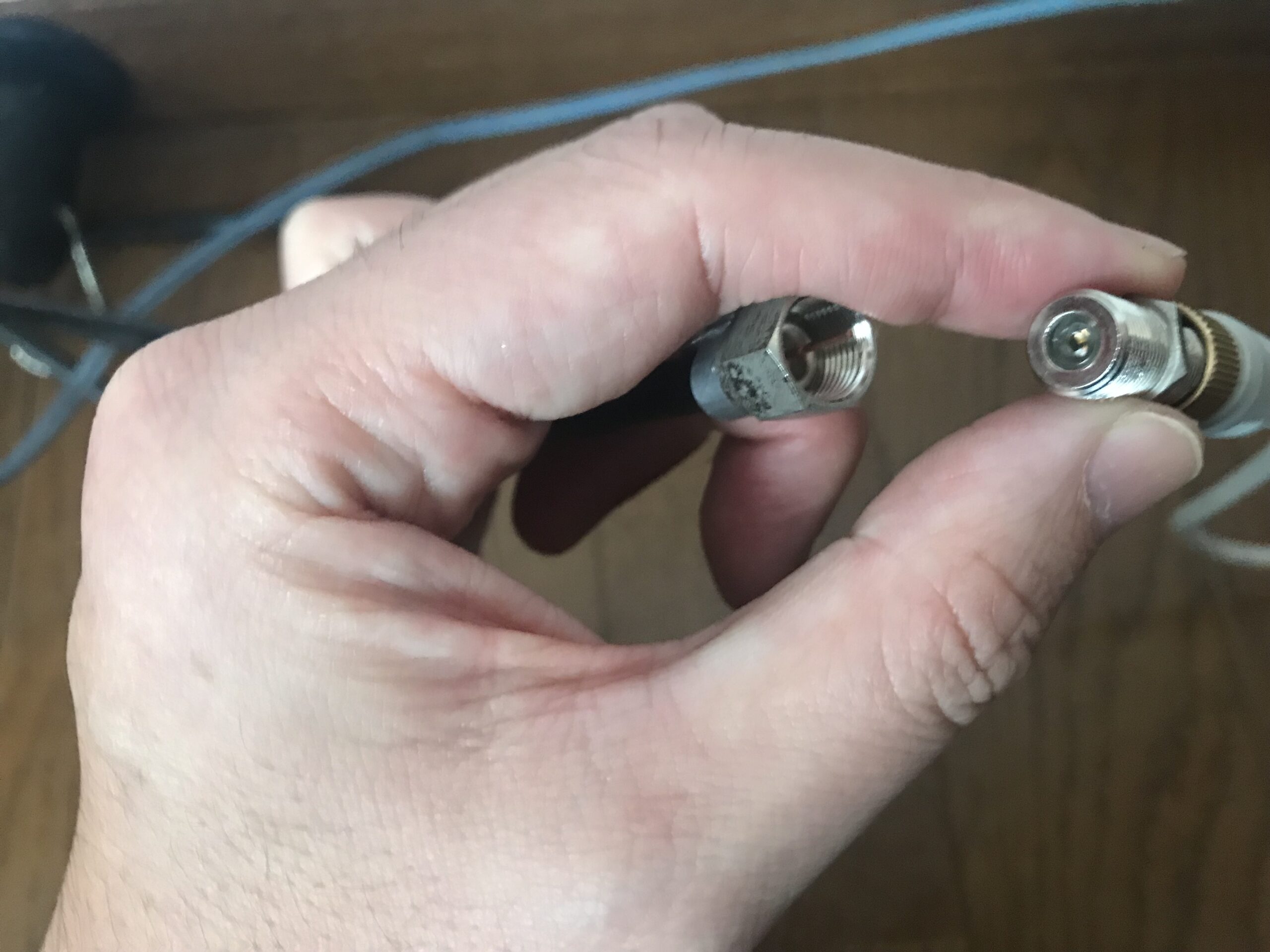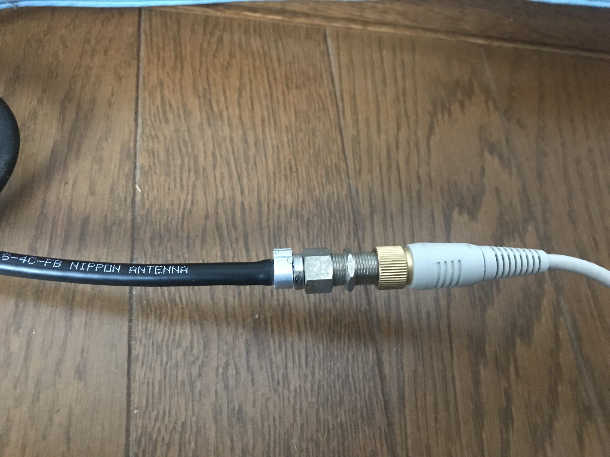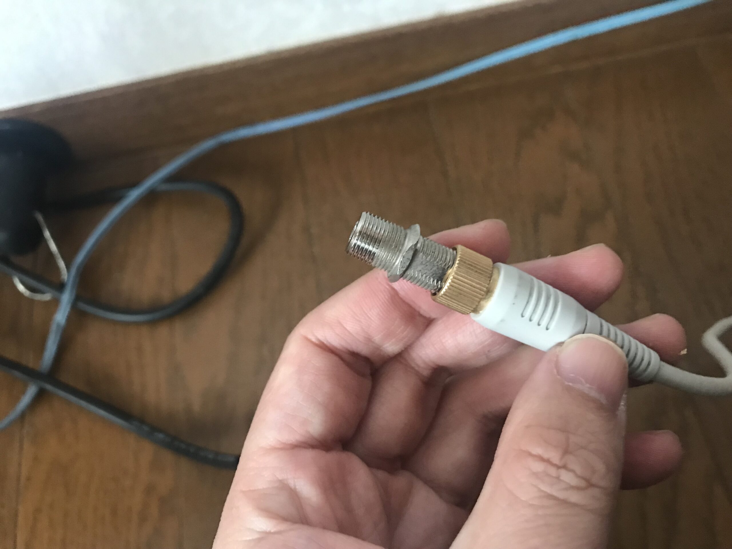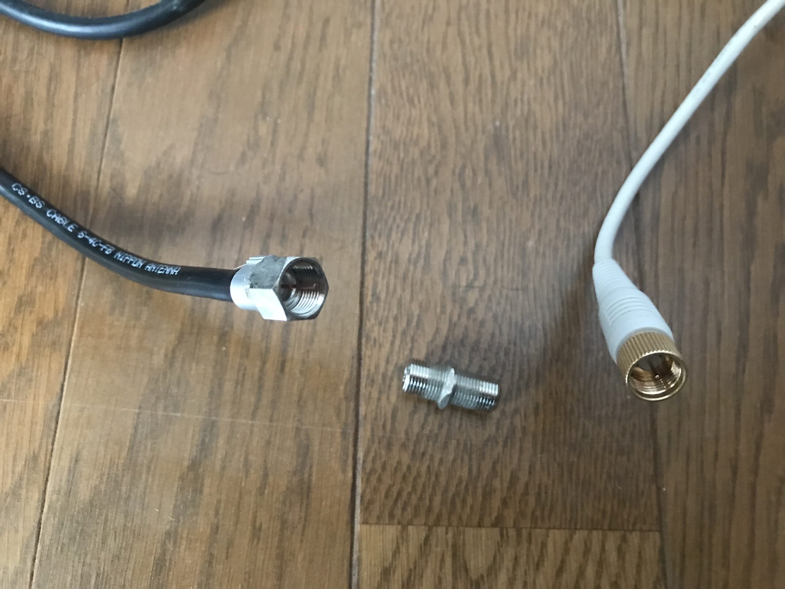 ケーブル側はどちらもオスで、アダプタがメスになっています。1方向ずつ接続してアンテナケーブル先端の端子のネジを回して固定すれば延長完了です。テレビと壁の端子には、テレビ視聴可能な部屋と同じように繋げば、テレビが映ります。