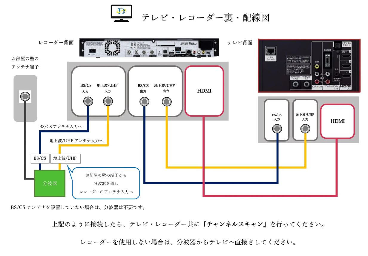 地デジ、衛星放送(BS/CS)または両方を視聴、レコーダーを使用など環境に配線の繋ぎ方も異なりますのでご注意ください。