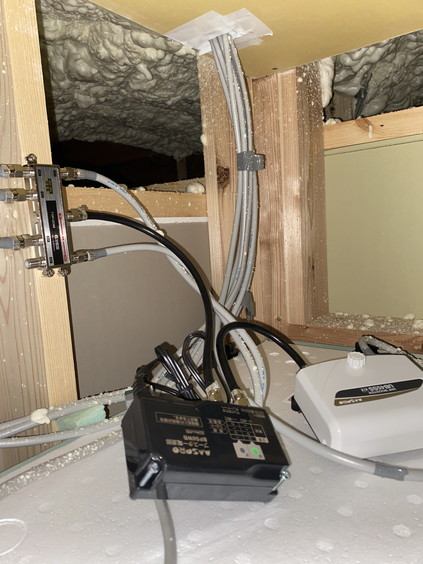 つづいて屋内配線の様子をご紹介。屋根裏にブースターと電源を設置してユニコーンアンテナで受信した地デジ電波を強くしています👍