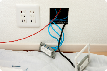 電翔のLAN配線工事は、単にインターネットスピードを向上するだけでなく、LANケーブルを壁内配線やモール配線などによって内観の見映えの悪化を防ぎます。 よくあるLAN配線は、ONUが設置されている部屋からLAN端子のない別室までLANケーブルを露出させたままで、歩行や家具配置の妨げになりやすく、場合によってはドアの開閉に影響を及ぼすことも少なくありません。 こうした問題は電翔が全て解決。内観を損ねずドアの開閉の妨げにならない綺麗なLAN配線が行えてお客様にも大好評です。