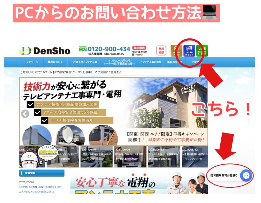 電翔ホームページ、右上「1分で簡単チャット」または、右下「チャットで簡単見積り」クリックでお問合せ下さい。