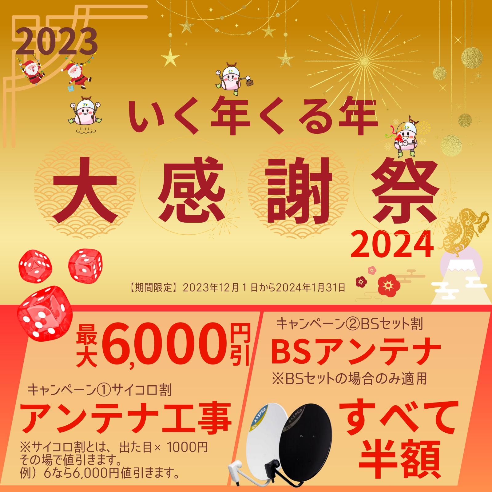 アンテナ工事 最大6,000円割引(サイコロ割)