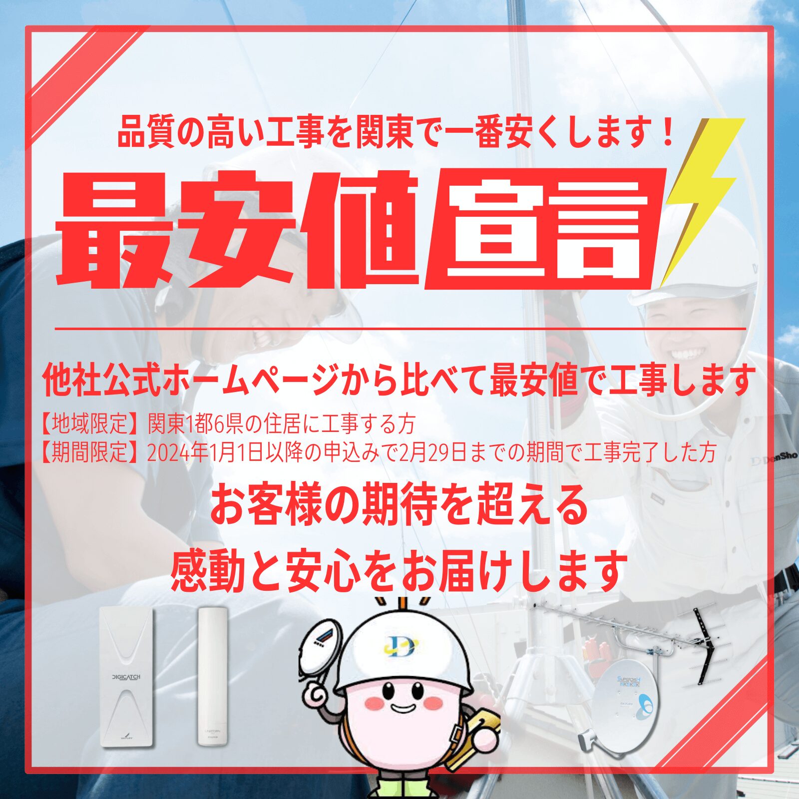 対象エリアの他社公式HPの料金よりもお安く工事をいたします。「品質の高いアンテナ工事」を関東最安値でご提供します!