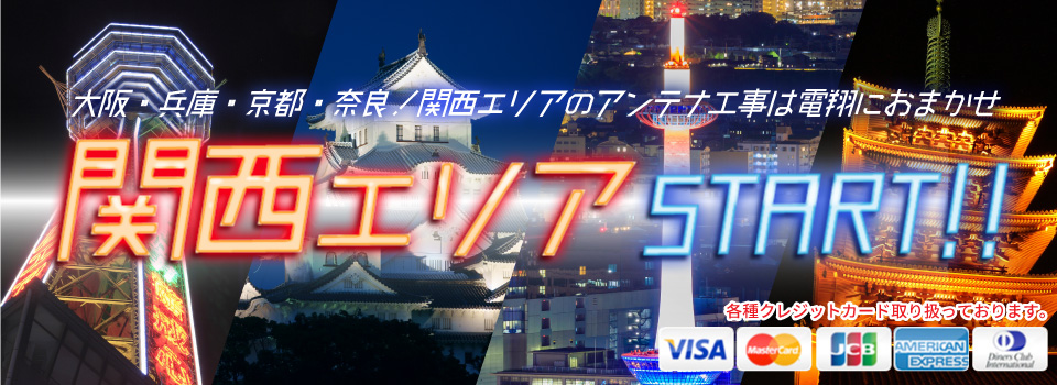 大阪、兵庫、京都、奈良!関西エリアのテレビアンテナ工事は、是非、電翔にご相談ください。これまで、戸建物件や集合住宅など、多数のアンテナを工事を手掛けた電翔は、高い技術力が自慢です。キー局はもちろん、テレビ大阪、京都放送、奈良テレビ、サンテレビ(兵庫)など地方局も視聴出来るよう、しっかりと電波測定を致します。無料で現場調査も行っていますので、まずはお気軽にお問合せ下さい。