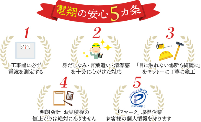 私たちテレビアンテナ工事の電翔は、お客様に喜んでいただくため、お客様目線で考え、行動し、よりよりサービスを提供できるよう努めております。アンテナ工事に対する、信頼性・対応品質第一を心掛けるほか、予期せぬトラブルにスピーディーに対応し、充実のアフターフォローでお客様のテレビライフをサポートいたします。