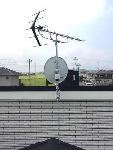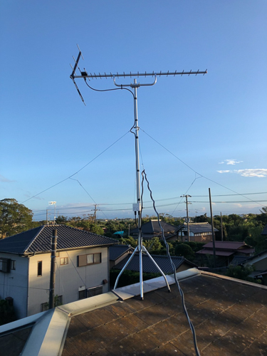 - 地上デジタル放送の視聴を目的としたアンテナ工事です。周りに障害物が少ない屋根上は、感度の強い電波受信が期待できます。倒壊防止には四方にステンレス製の支線を使ってしっかりと支えています。