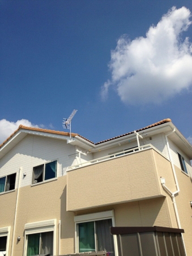 - ベージュとホワイトのツートンカラーで、暖かみのある素敵なお家でした。ご新築の完成に合わせて、地デジのテレビアンテナ工事を実施。屋根の破風板設置を採用したので、外につけるパターンの中でも比較的コンパクトに納めることができました。