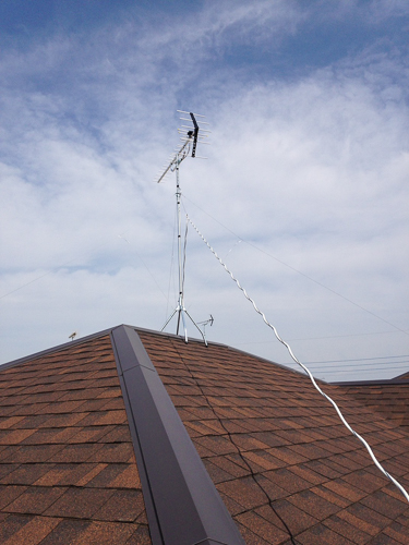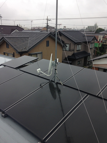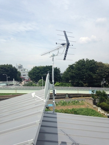 • 段違い屋根に、地デジと衛星放送用アンテナを取り付けた事例です。電波状況を考慮して、設置場所は家の中でも一番高い尾場所を選んでいます。2種類のアンテナも1本のマストですっきりとまとめることができました。