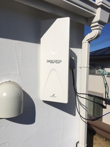• 屋根上に太陽光パネルが設置された戸建て物件です。お客様と相談の上、屋根の破風板に取り付けることになりました。太田市内の場合は県内の前橋中継局や隣接する埼玉県の中継局、さらに東京スカイツリーの電波範囲内。安定性重視に、受信局を選んで施工を行います。