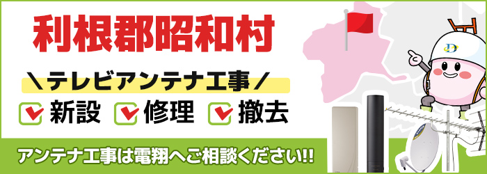 - 群馬県利根郡昭和村のテレビアンテナ工事は、専門業者の株式会社電翔へお任せください。施工実績豊富な電翔が、群馬県利根郡昭和村エリアの立地やご物件の特徴に合わせた施工をご提案いたします。新設はもちろん、修理や不具合系のご相談も歓迎です。まずはお気軽に無料見積もり相談をどうぞ。