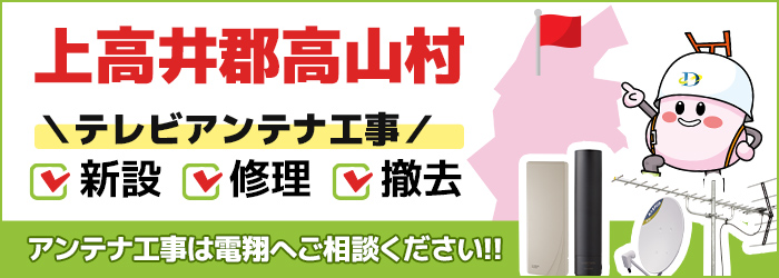 - 群馬県吾妻郡高山村のテレビアンテナ工事は、専門業者の株式会社電翔へお任せください。施工実績豊富な電翔が、群馬県吾妻郡高山村エリアの立地やご物件の特徴に合わせた施工をご提案いたします。新設はもちろん、修理や不具合系のご相談も歓迎です。まずはお気軽に無料見積もり相談をどうぞ。